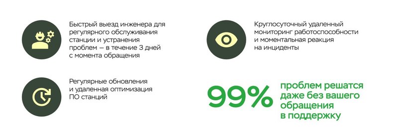 - Техническое обслуживание: дистанционный мониторинг, обновление ПО, оперативную замену оборудования при поломках.